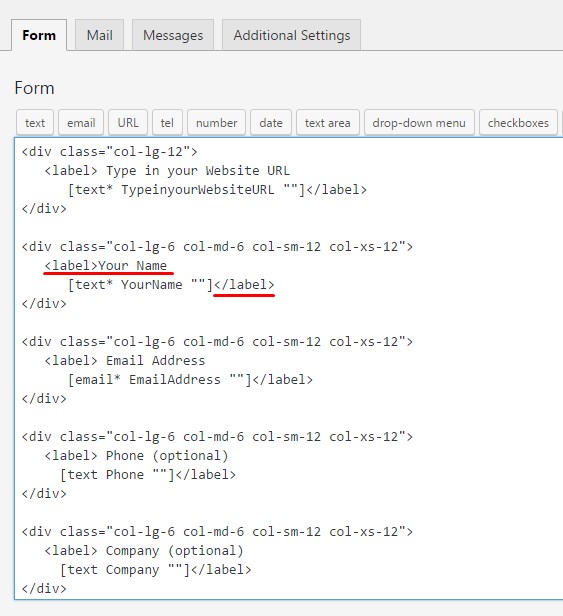 The above information describes the way to add form fields with placeholders. If you want your fields to have labels instead, you should wrap field shortcodes into <label></label> tags as in the example below.