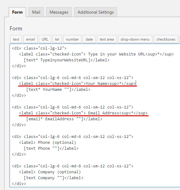 If you want to make form fields required as shown in the form above, you need to do the following: