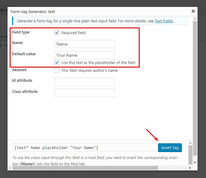 In the popped up window fill in 'Name' and 'Default value' fields. On demand check ' Use this text as the placeholder of the field' and 'Required field' checkboxes.