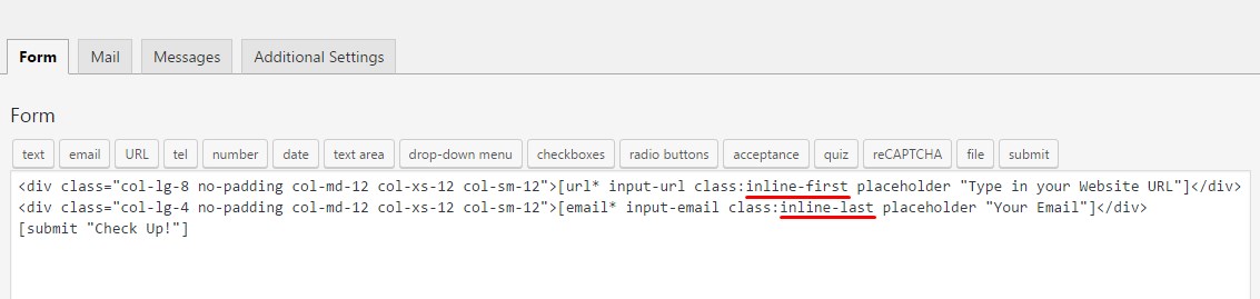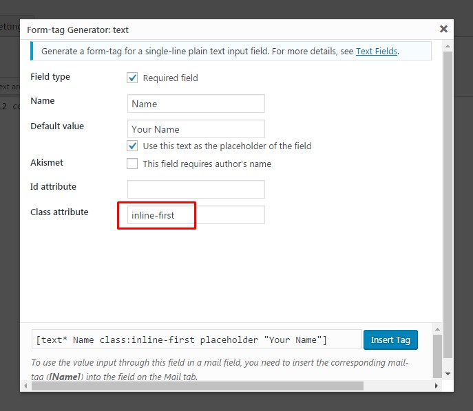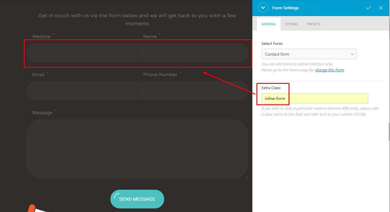 IMPORTANT: If you want to add a form with square border on one side, like the one on the image below, you need to enter classes inline-first and inline-last into 'Class Attribute' field.