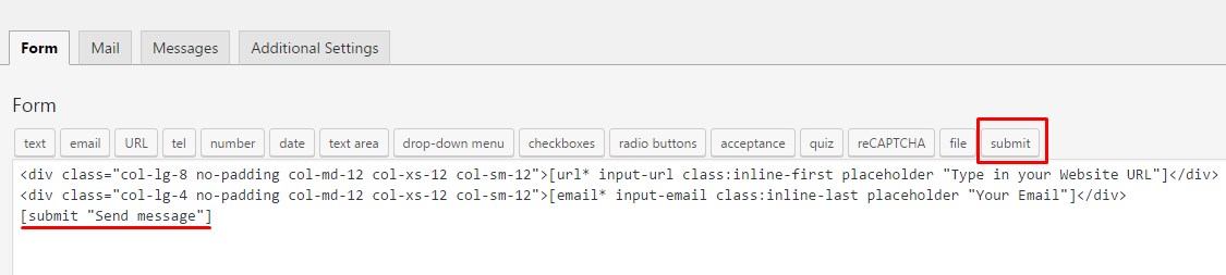 Once you've added all form fields, add Submit button shortcode without any HTML tags.