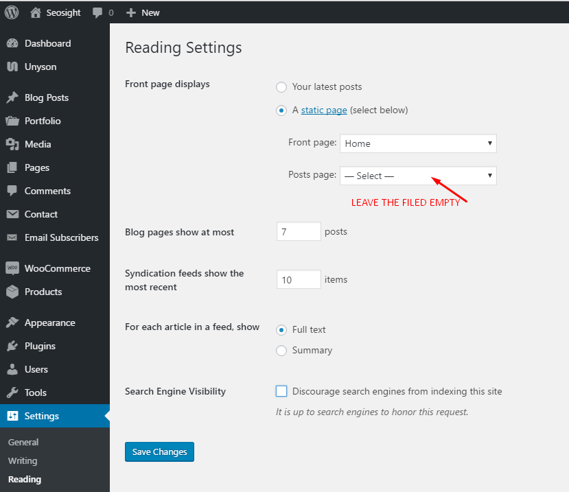 Once you have activated 'A static page' option you can see another dropdown list called 'Posts page'. This option is required to enable posts page in default Wordpress themes. In Seosight it is not required. So you can leave this field empty.