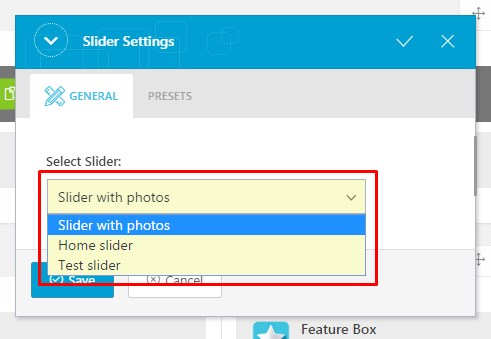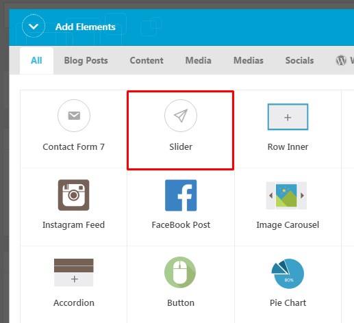 To add slider on your page, choose 'Slider' shortcode in King Composer editor and select required slider from the sliders list.
