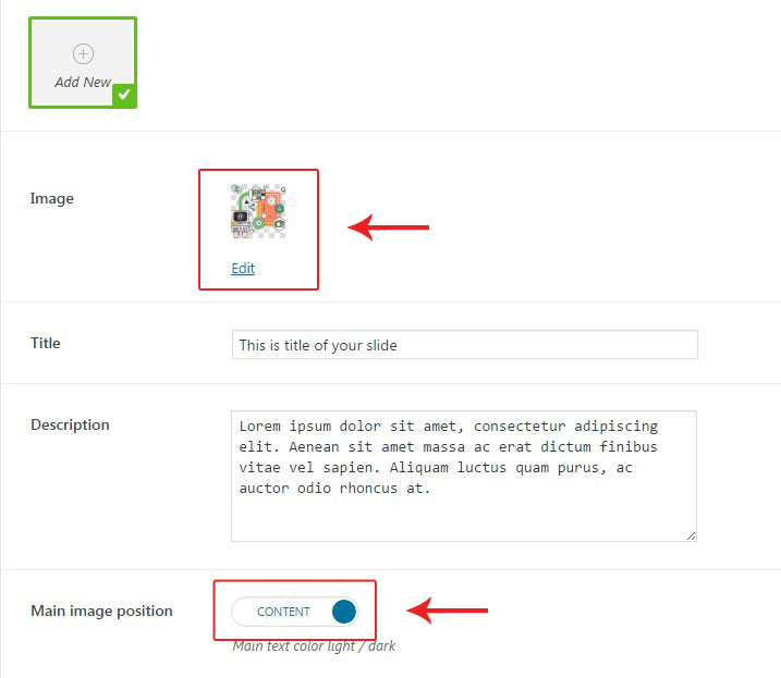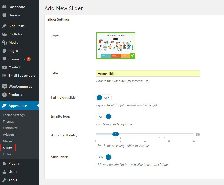 Fullscreen slider is created under Appearance>Sliders section. Click on Add New button and configure general slider settings: