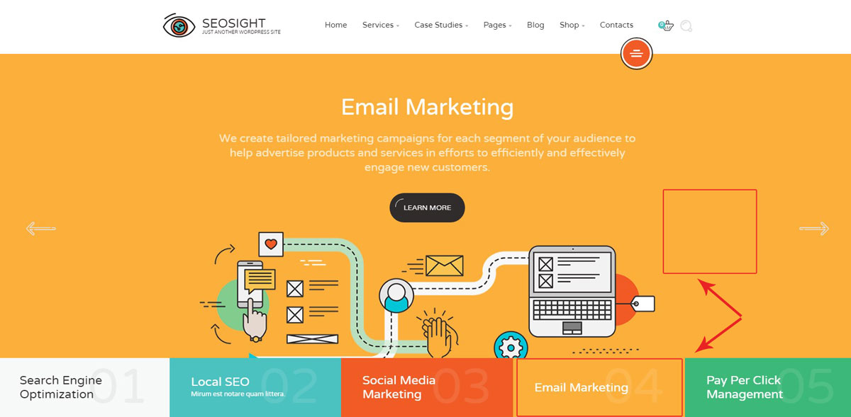 Aside panel is a hidden menu that is opened by clicking on the round red icon on the right side under the top menu.