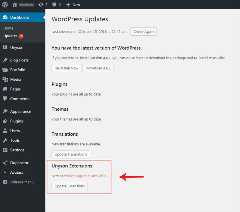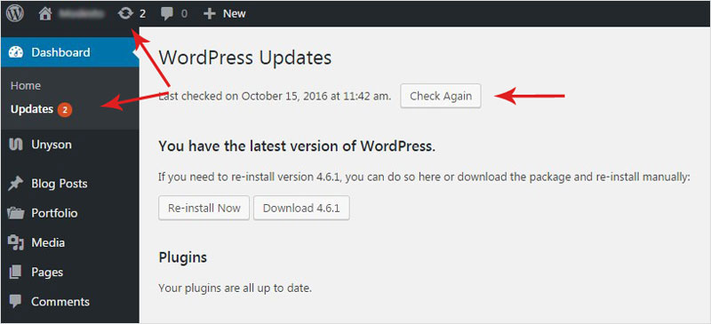 The Dashboard Update Screen provides information on available updates. The number of available updates appears as a notification bubble next to the Updates menu item.