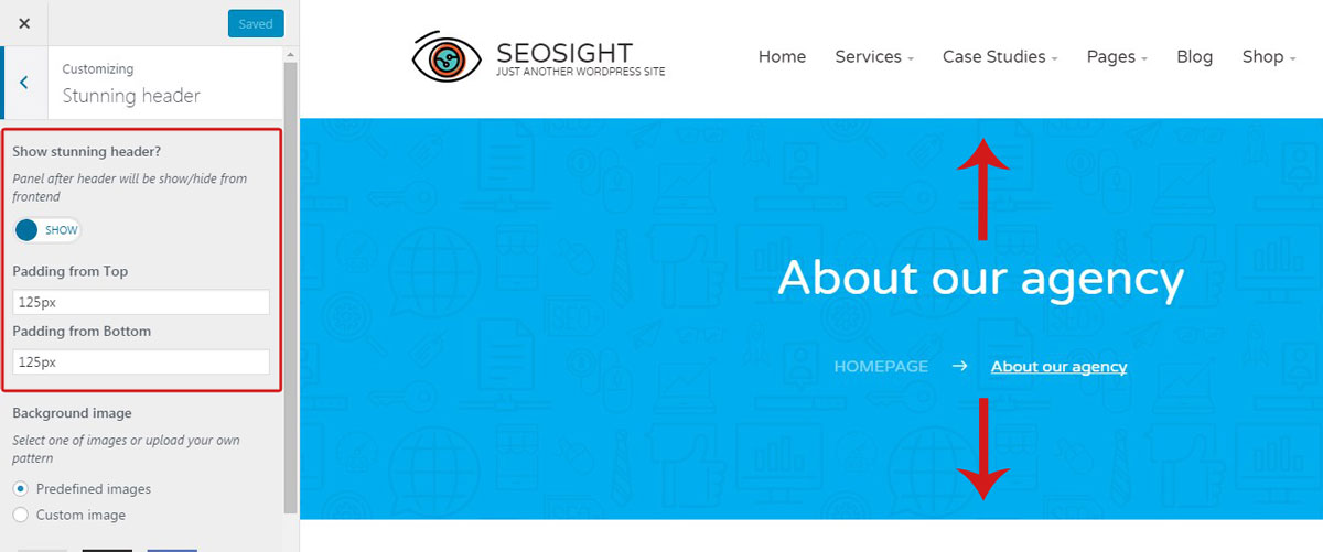 In the same section you can control size of paddings on the top and bottom of the stunning header.