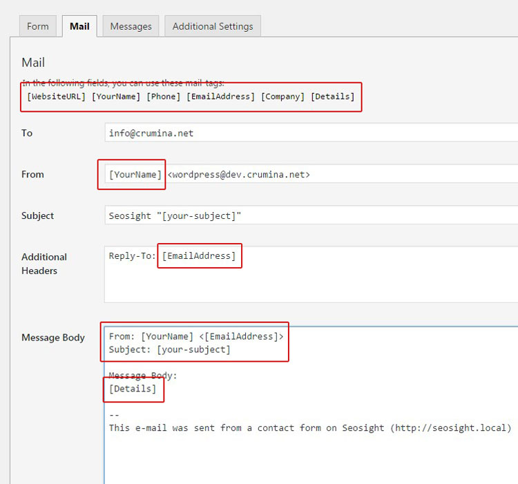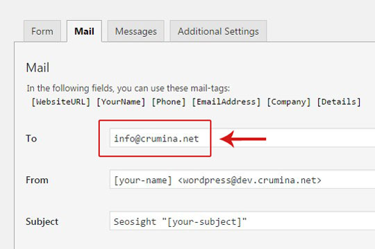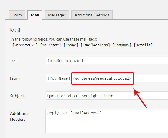 For example, if my site is at http://seosight.local , the code must be <wordpress@seosight.local>