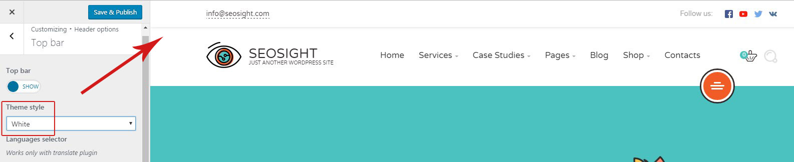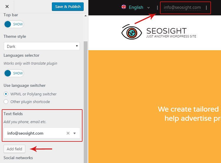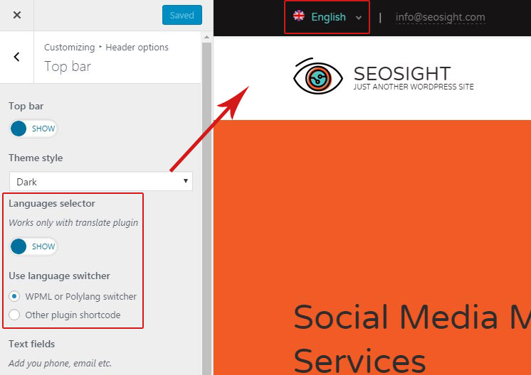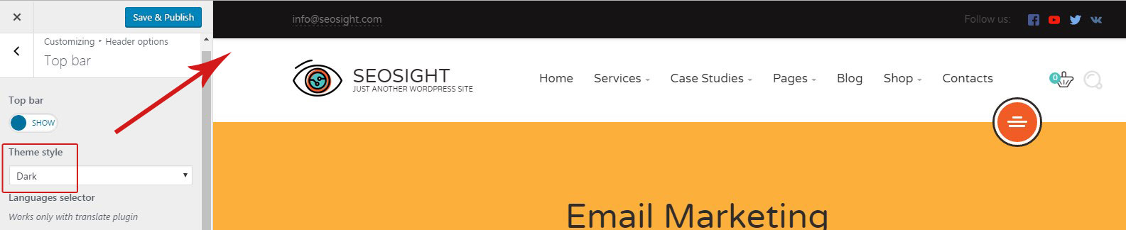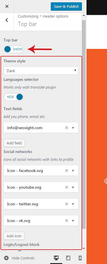 By default top bar is disabled. Go to Customize>Header options>Top bar and activate it by switching toggle to 'Show'. Below will appear all options available for the top bar.