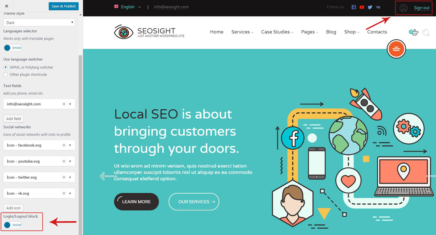 King Composer plugin comes bundled with Seosight and is the main page builder in the theme. It provides backend and frontend editors. You can use one that is more convenient for you.