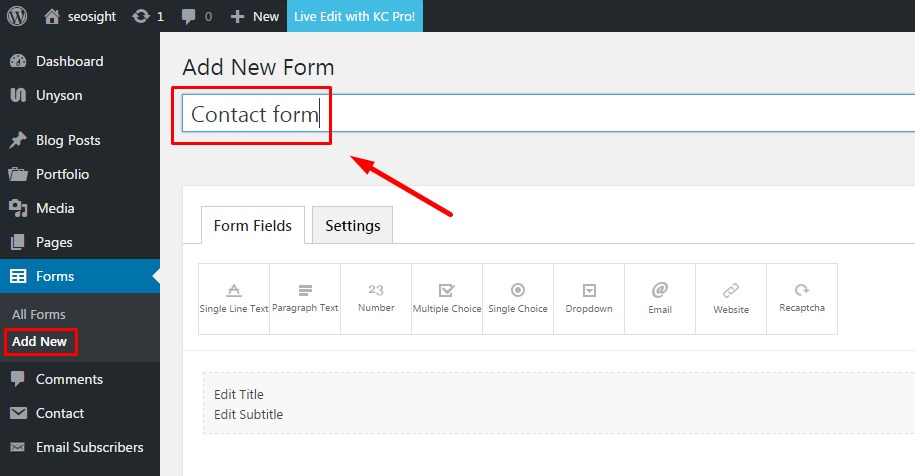 To create a new form go to Forms>Add new and type in the title of your form. Title is displayed only on the backend and is needed only for easier navigation through your forms.