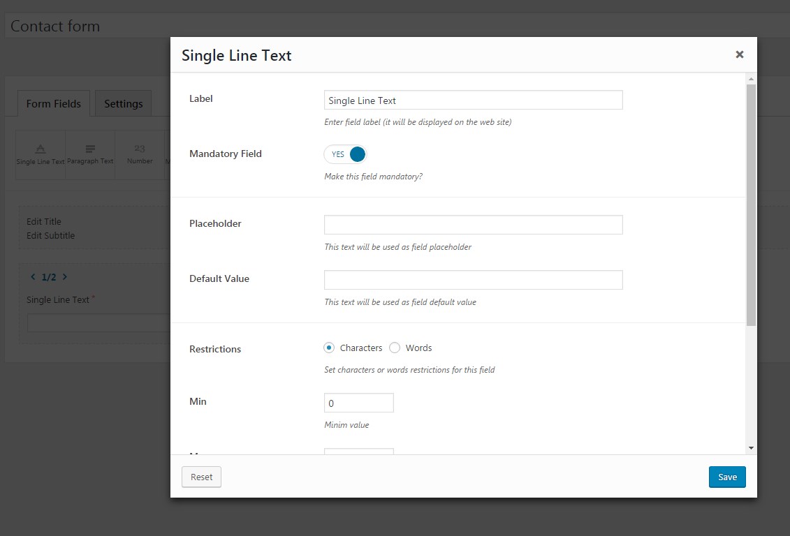 Once you have added a field, click on it one time to open settings window. Each field type has its own settings. Configure each field and press "Save" button.