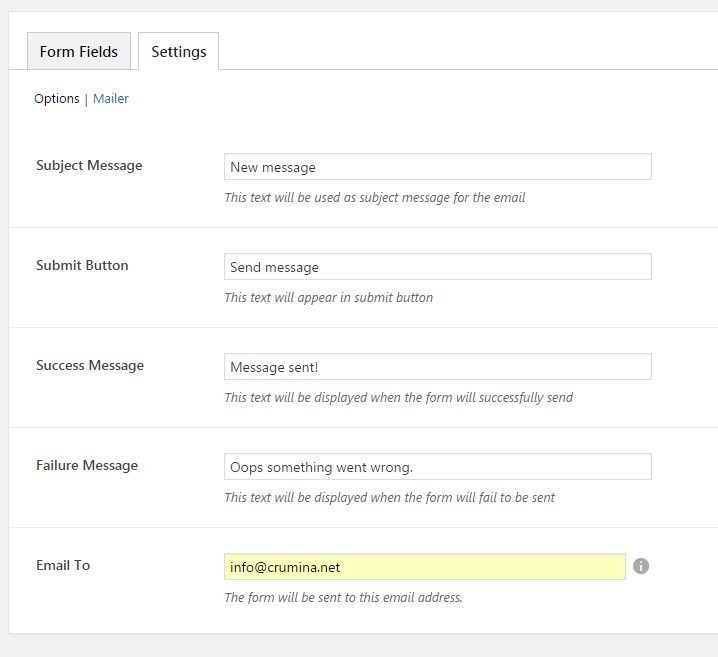 After you have finished adding form fields, switch to the 'Mail' tab and set up email submission and message template options.