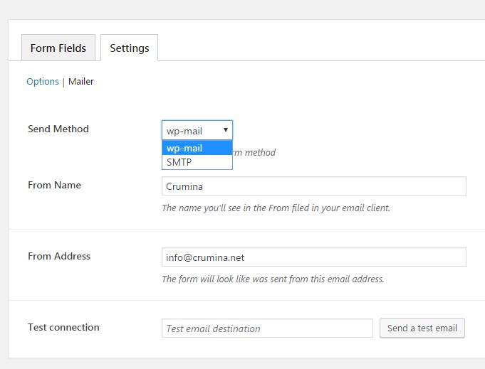 Under Settings>Mailer you can set up send method and test connection by sending a test message. You can also fill in the "From Name" and "From Address" fields, that will be displayed in all received emails.