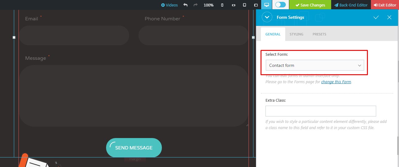 As alternative to the integrated contact form builder, forms can be created with Contact Form 7 plugin. It comes bundled with the theme and is fully supported by it.