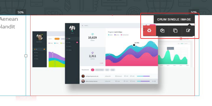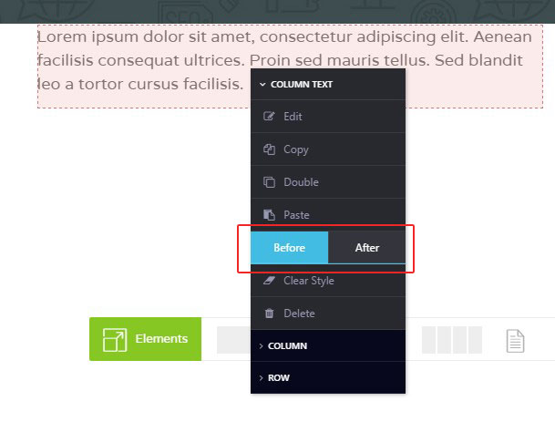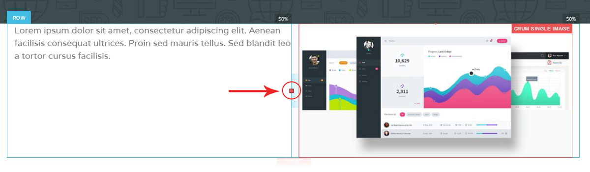 Columns width management. You can change width of the columns in the row with simple drag and drop function. Simply hover over the square between the columns, hold it with the left mouse button and drag the mouse to the left/right changing width of the columns.