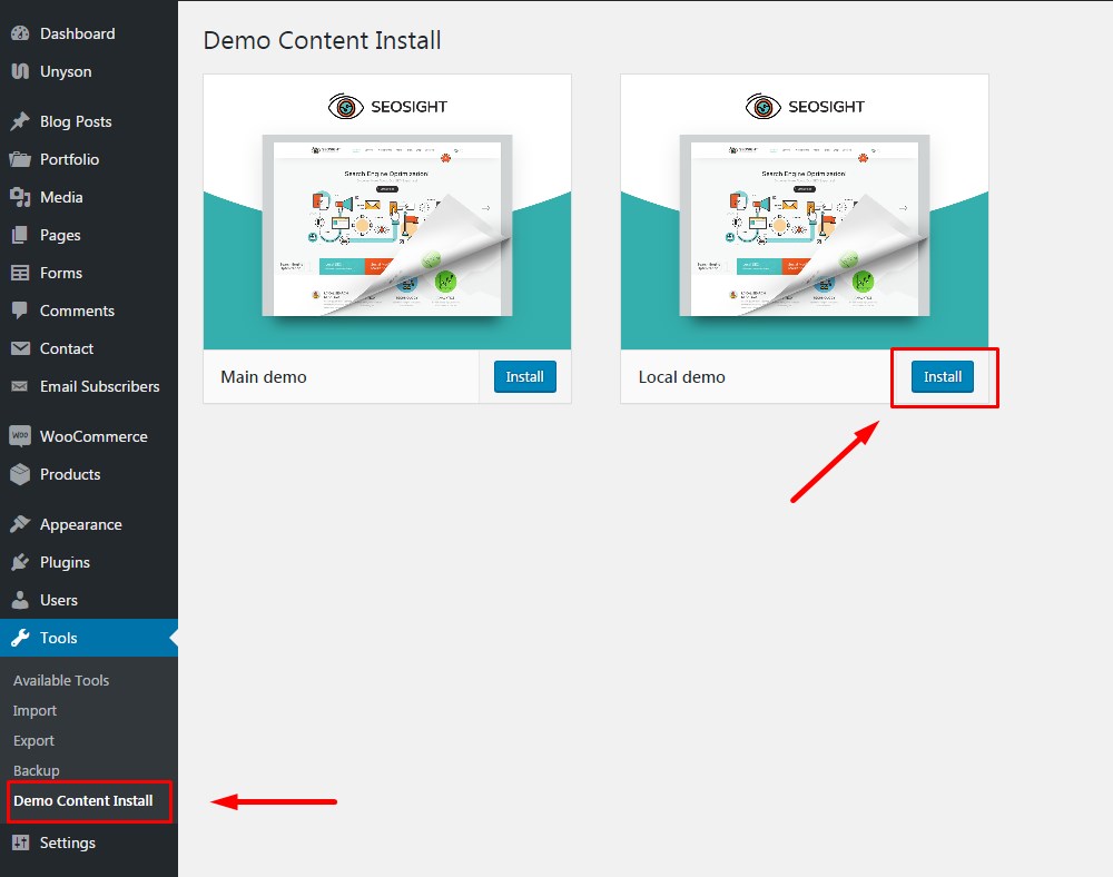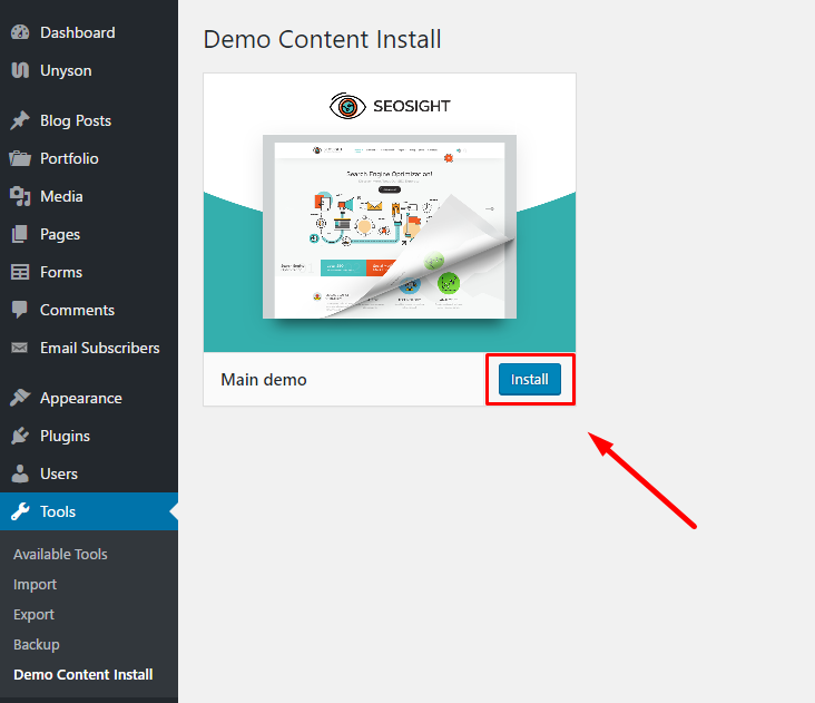 When installation process is finished, you're automatically redirected to the 'Demo Content Install' section. Click on the 'Install' button and wait a few moments.