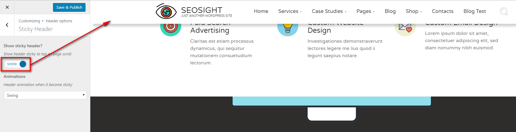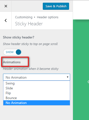 When sticky header is activated you can also set the animation when it appears/hides on scroll or turn it off:
